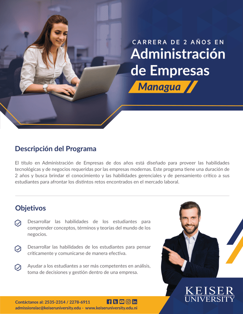 The two-year Associate in Business Administration degree is designed to provide the technological and business skills required by modern companies. This program lasts two years and seeks to provide its students with the knowledge and managerial and critical thinking skills to meet the various challenges encountered in the job market.