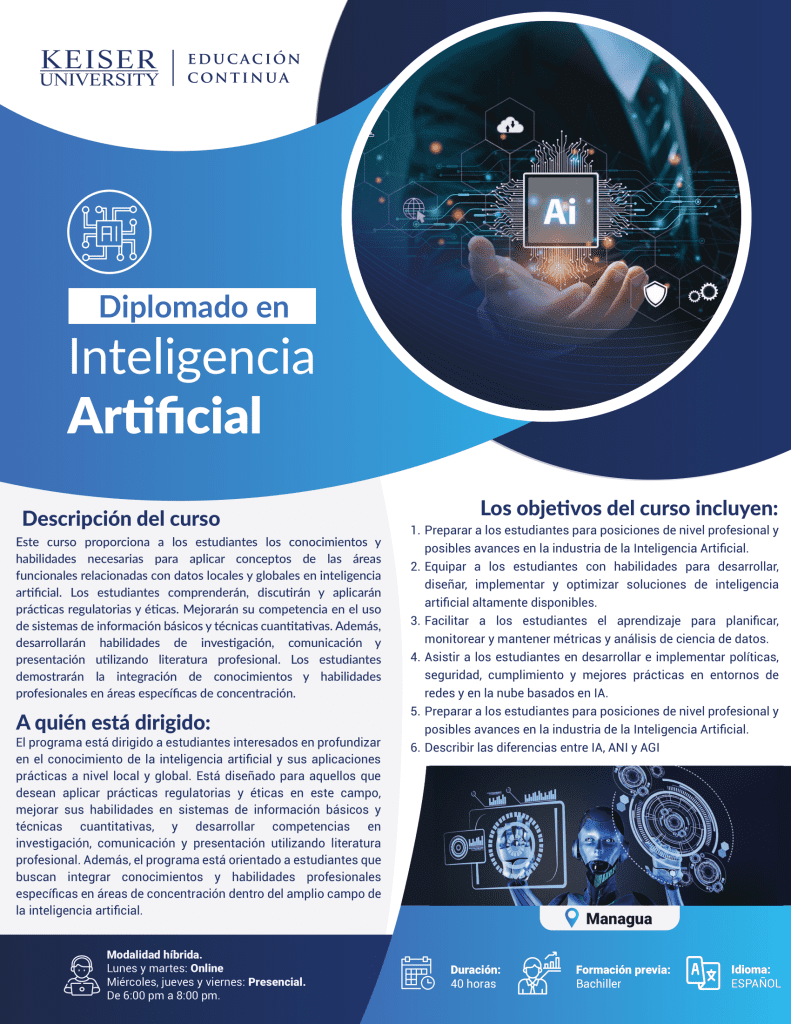 Este curso proporciona a los estudiantes los conocimientos y habilidades necesarias para aplicar conceptos de las áreas funcionales relacionadas con datos locales y globales en inteligencia artificial. Los estudiantes comprenderán, discutirán y aplicarán prácticas regulatorias y éticas. Mejorarán su competencia en el uso de sistemas de información básicos y técnicas cuantitativas. Además, desarrollarán habilidades de investigación, comunicación y presentación utilizando literatura profesional. Los estudiantes demostrarán la integración de conocimientos y habilidades