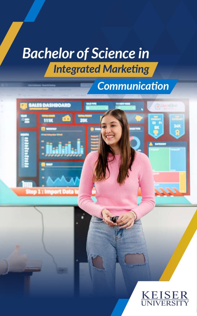 The Bachelor of Science in Integrated Marketing Communication at Keiser University prepares students for careers in marketing, advertising, public relations, communications, social media technology and applications, and management. Students take courses in management, marketing, public relations, social media applications and technology, and communications to learn key concepts for ethical decision-making and other essential elements of marketing and communication. They will also learn to apply marketing and communication theories and practices in both local and global work environments.