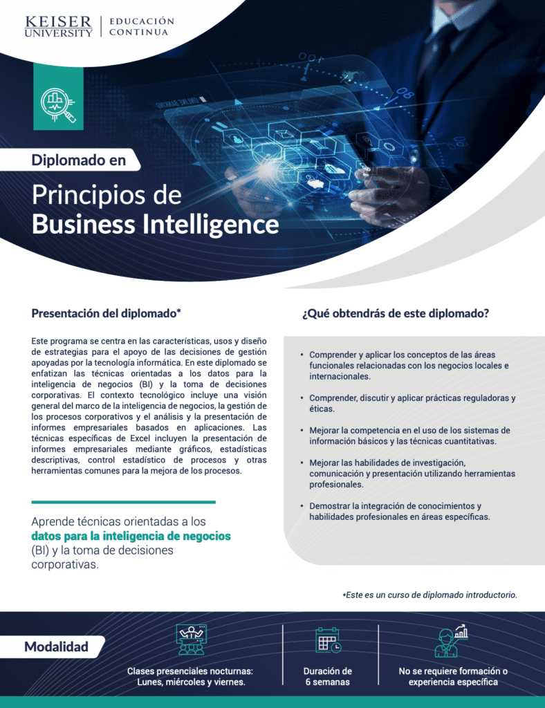 Este programa se enfoca en las características, usos y diseño de estrategias para la toma de decisiones gerenciales apoyadas en la tecnología de la información. El Diplomado hace énfasis en las técnicas basadas en datos para la inteligencia de negocios (BI) y la toma de decisiones corporativas.